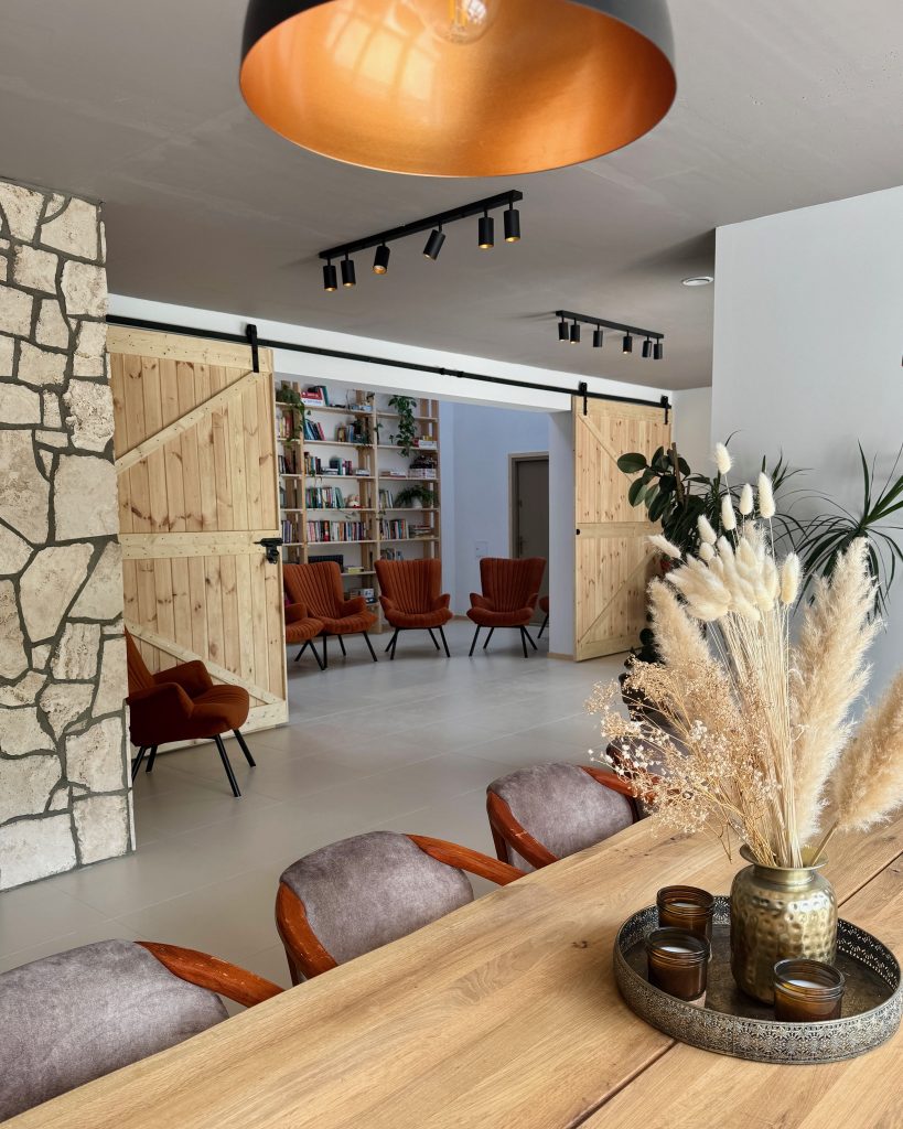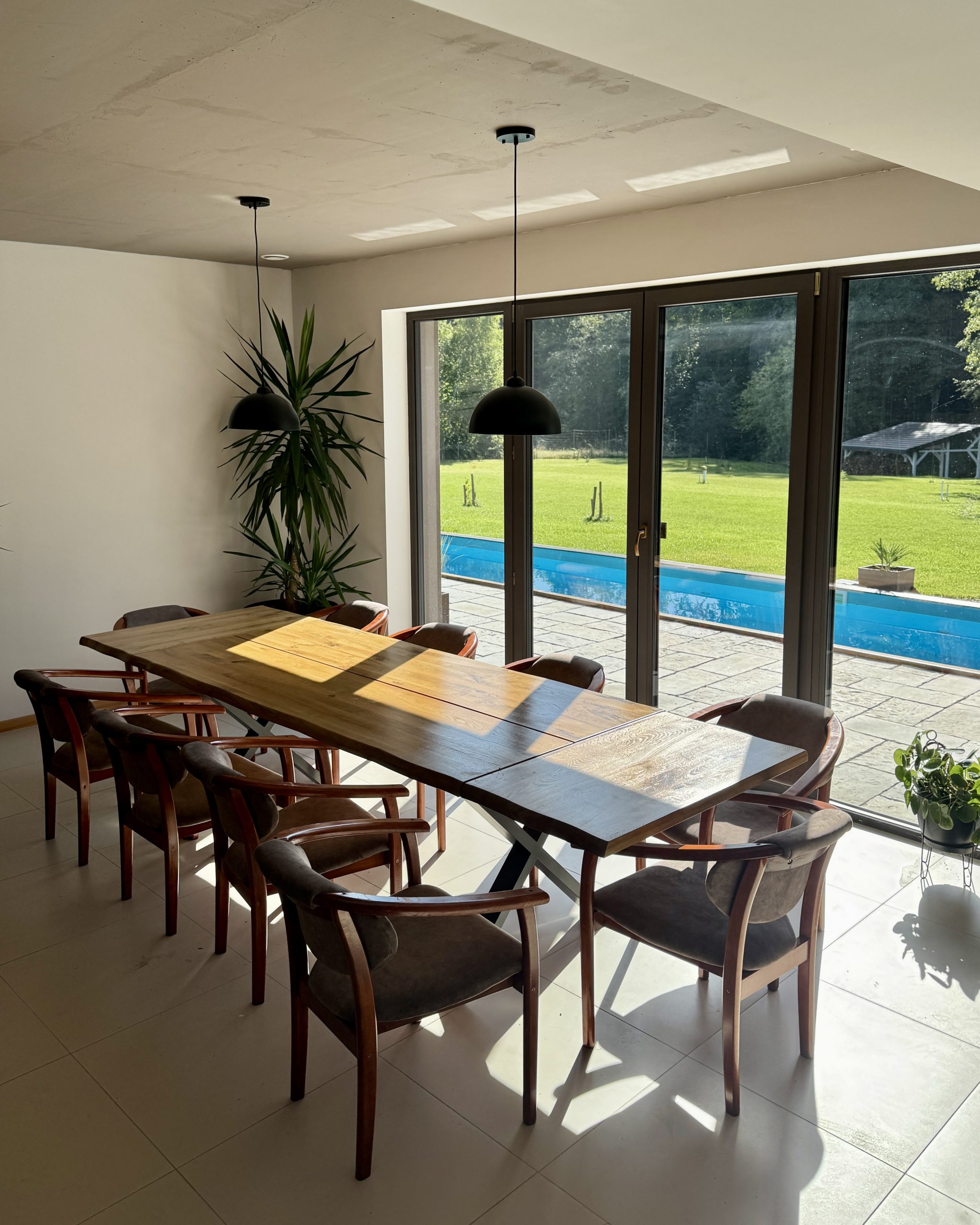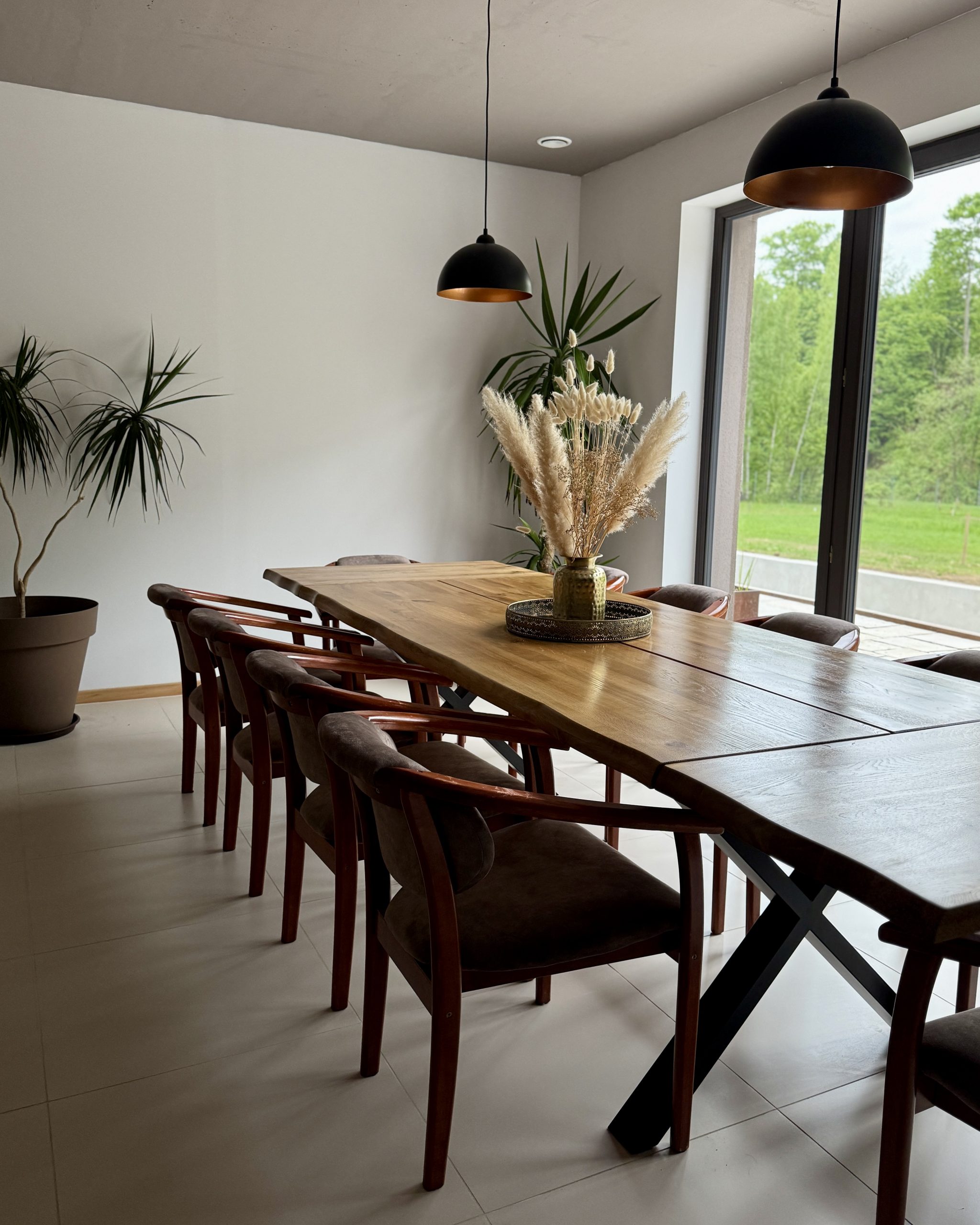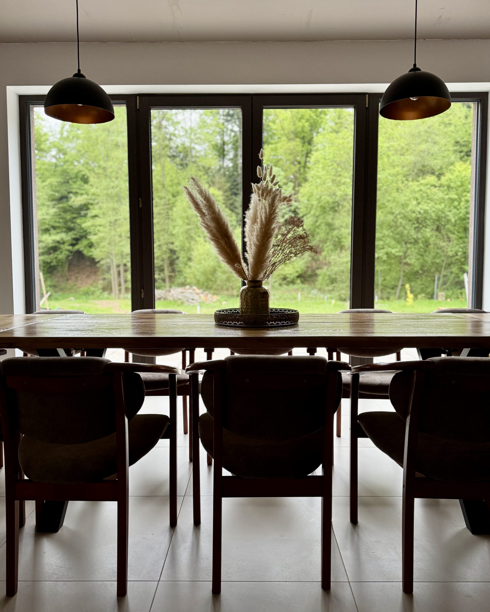Stół, światło i przede wszystkim spokój – to był nasz plan idealnej jadalni dla naszych gości. Ta piękna i wygodna przestrzeń sprzyja rozmowom, długim posiłkom i kreatywnym chwilom – również podczas przerw między blokami zajęć warsztatowych.