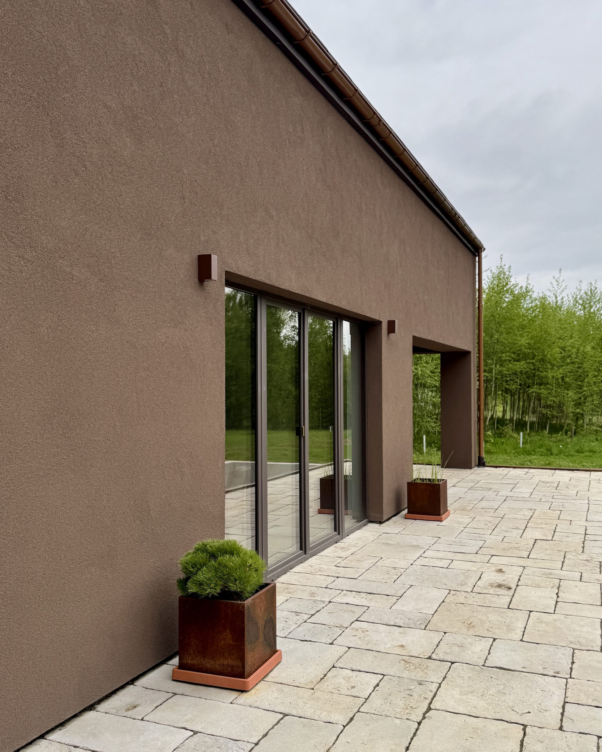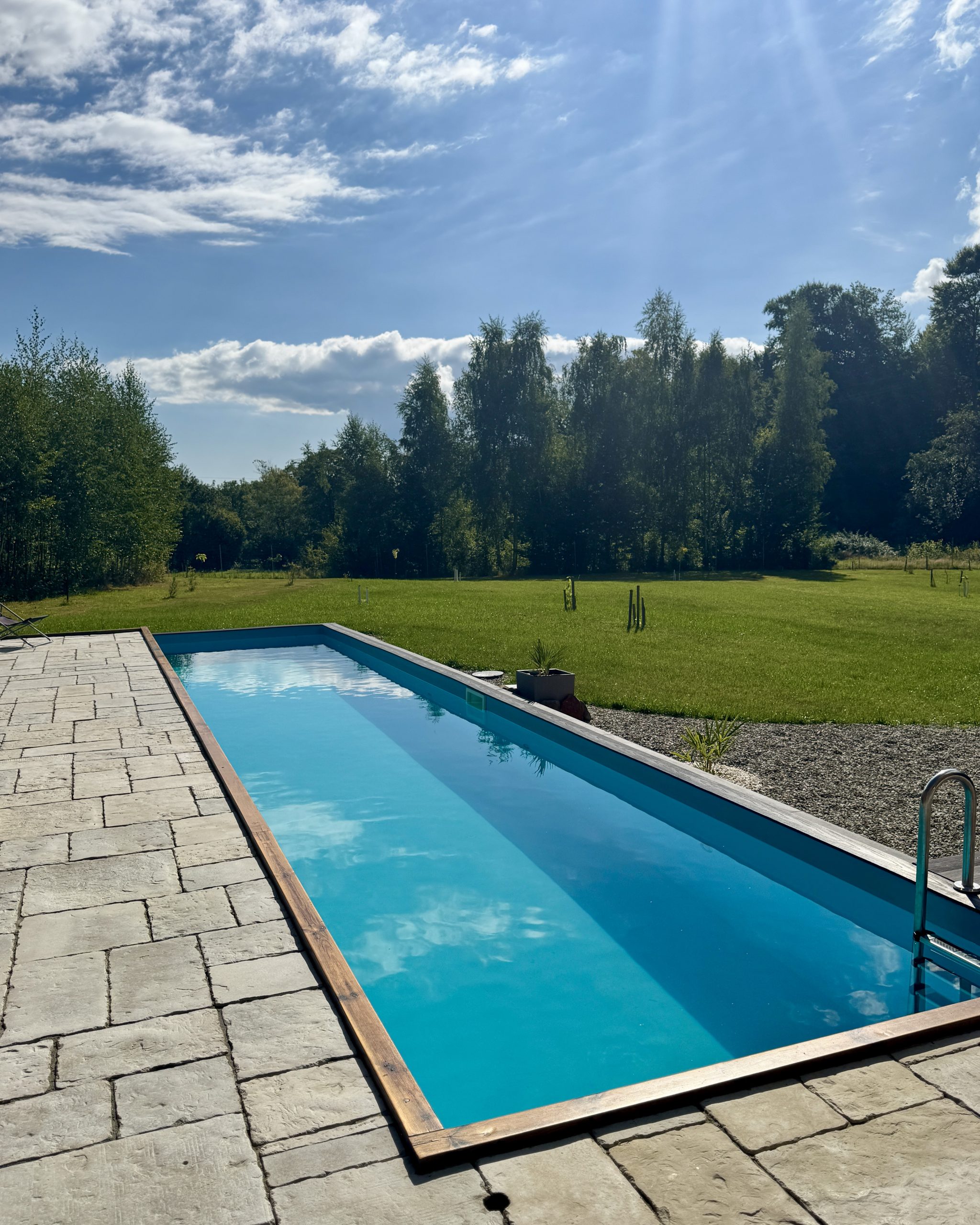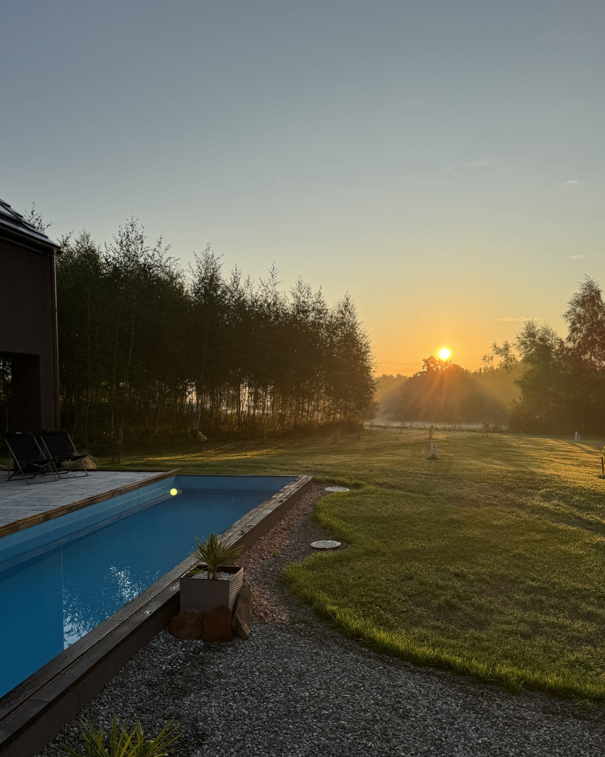 Obszerny taras na poranną kawę i wieczorny oddech. Basen sezonowo – łagodne ochłodzenie i chwila relaksu na świeżym powietrzu.