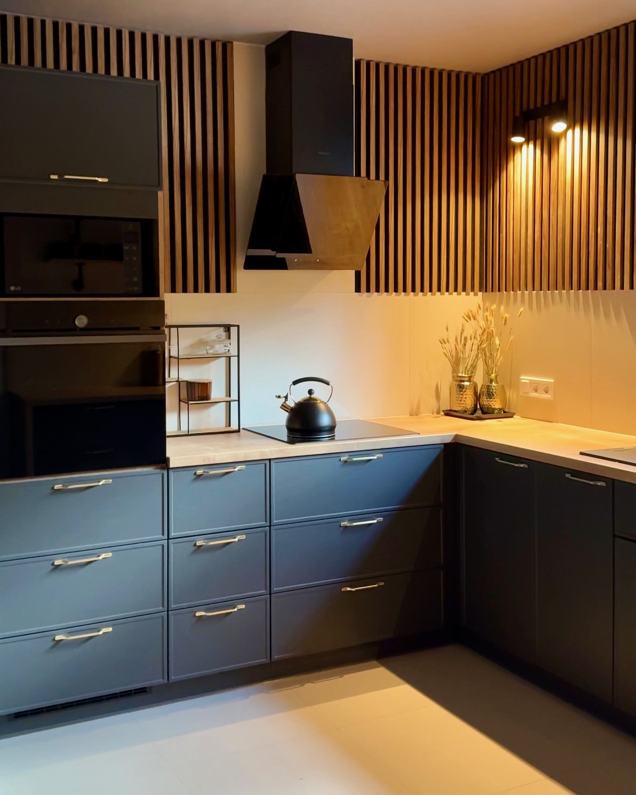 W Pracowni znajduje się w pełni wyposażona przestrzeń do wspólnych posiłków, ale też do warsztatowych przerw – praktyczna, domowa, gotowa na bufet lub rodzinne gotowanie.