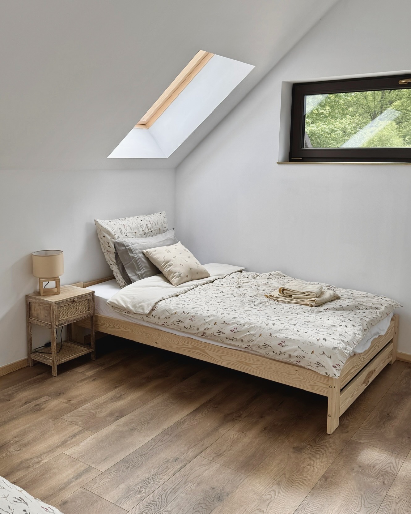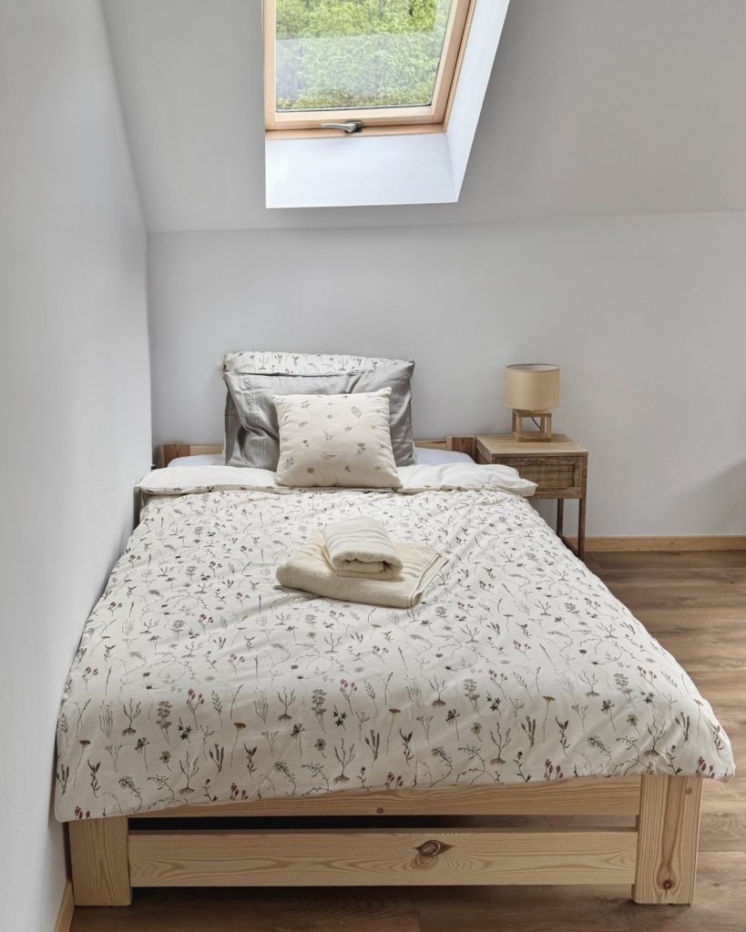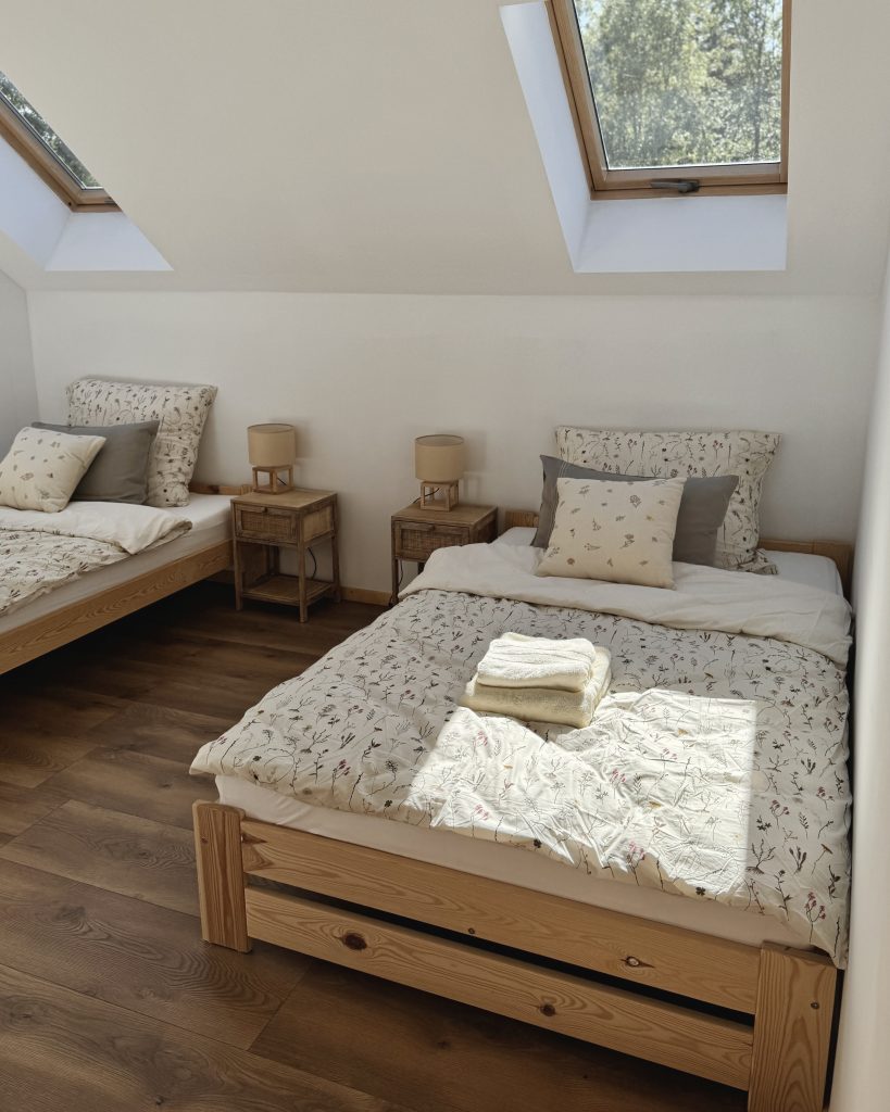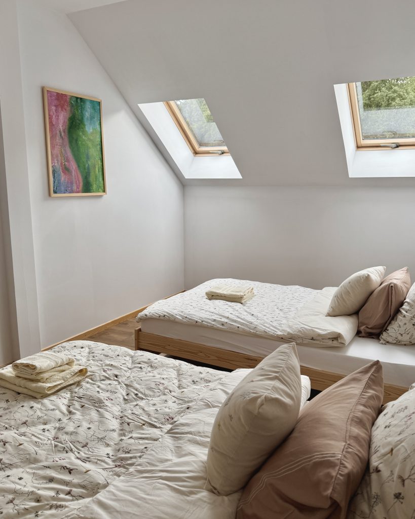 Mamy 7 kameralnych pokoi – dwu- i jednoosobowych – zaprojektowanych tak, by po intensywnym dniu warsztatowym lub rodzinnym spacerze możliwy był prawdziwy odpoczynek. Postawiliśmy na jasne barwy, miękkie tekstylia, a widok na zieleń wspiera spokojny rytm snu i poranków.
