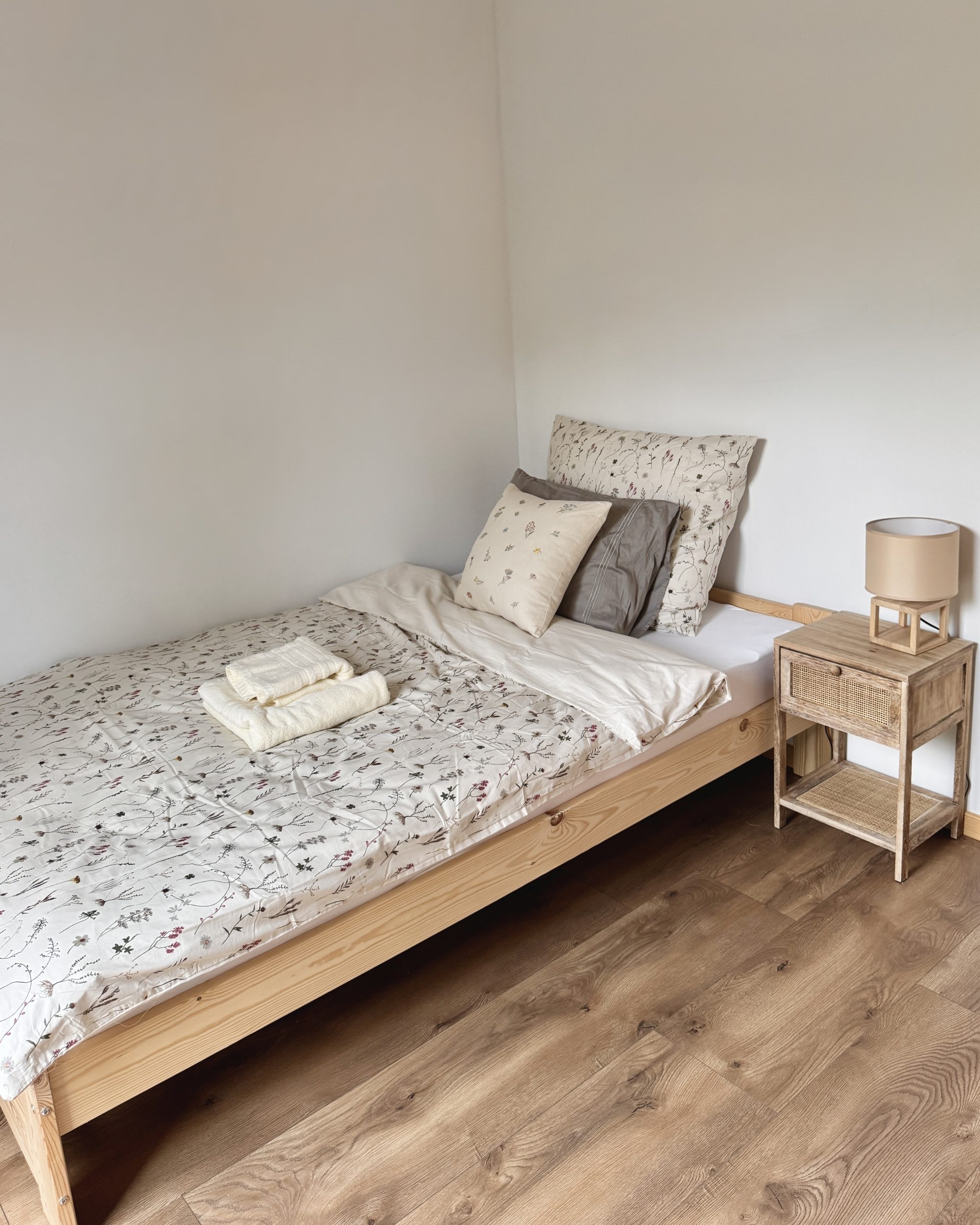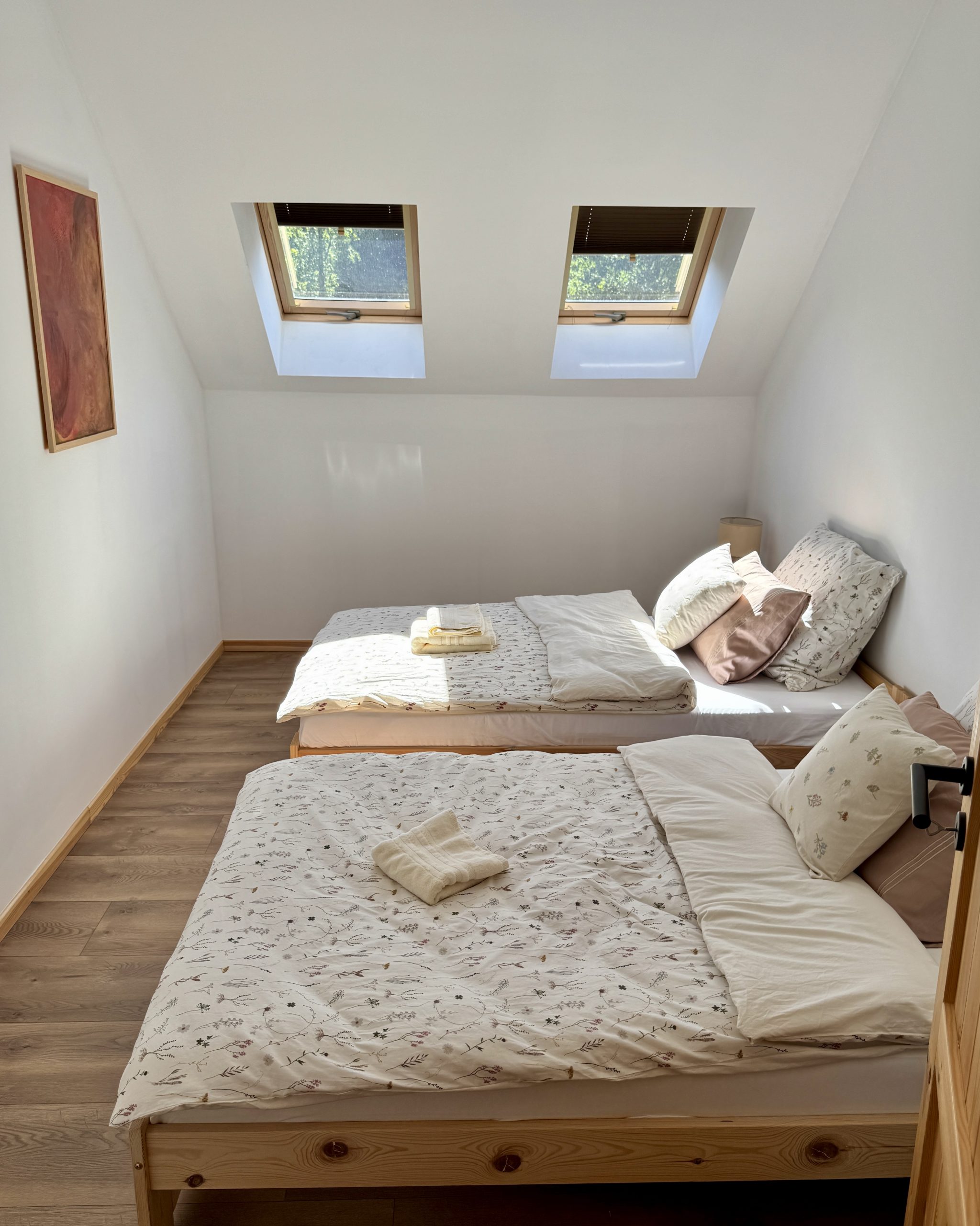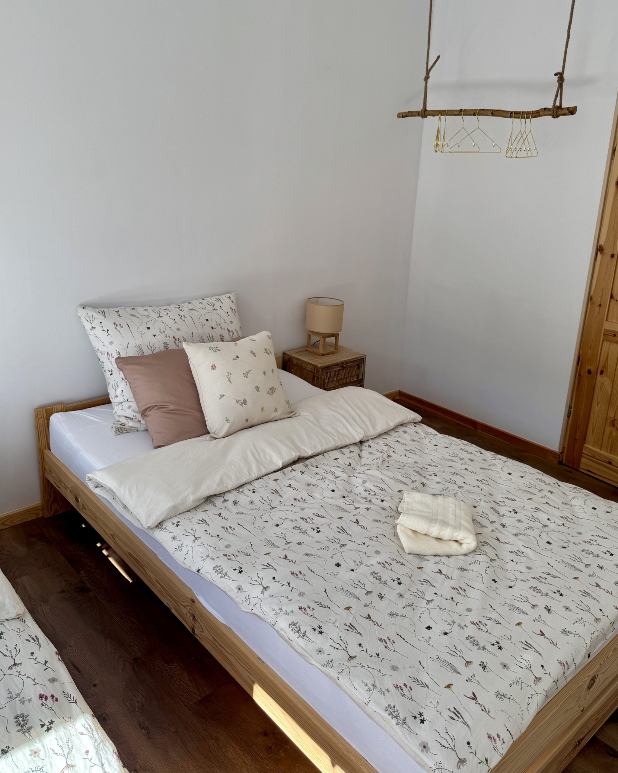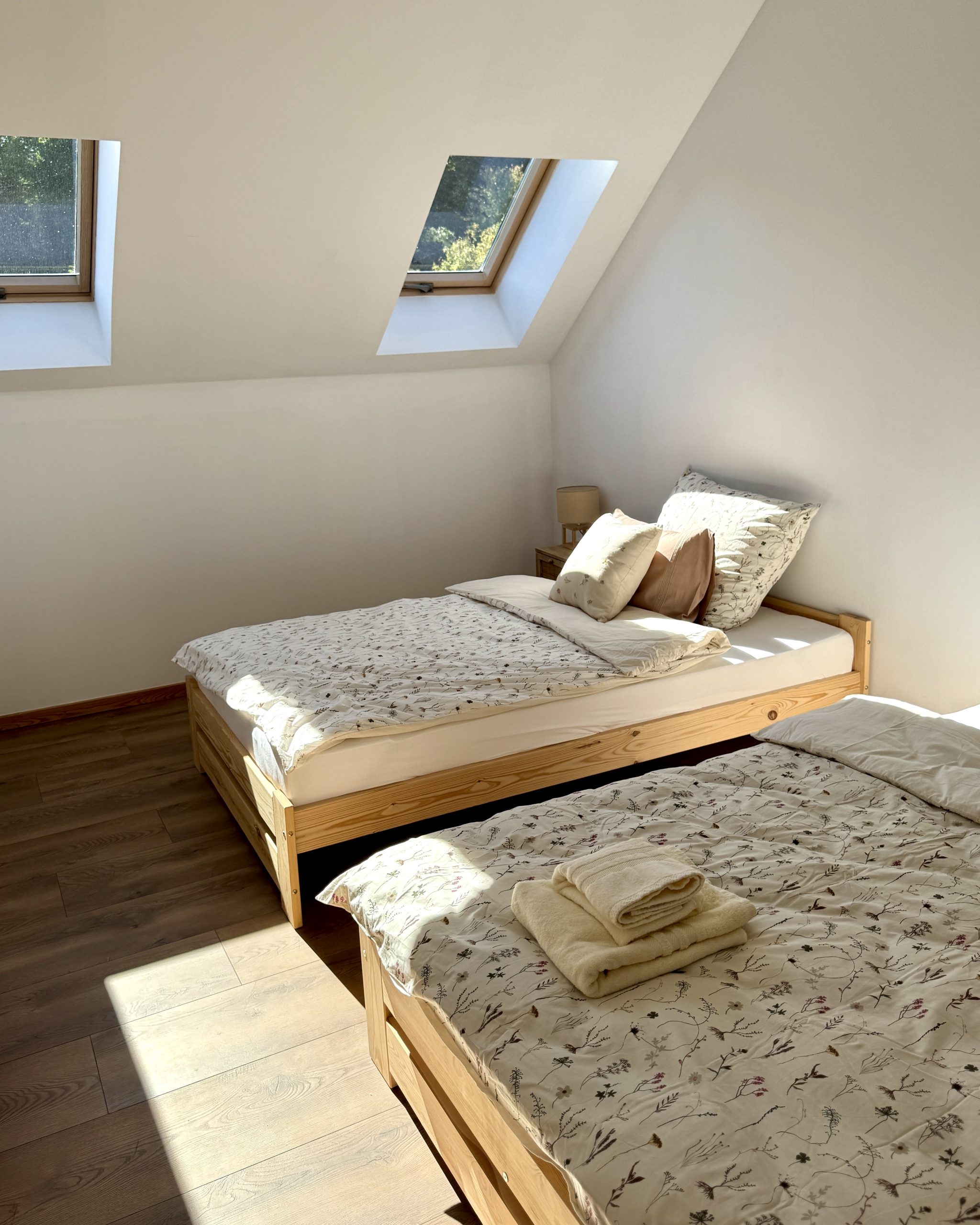 Mamy 7 kameralnych pokoi – dwu- i jednoosobowych – zaprojektowanych tak, by po intensywnym dniu warsztatowym lub rodzinnym spacerze możliwy był prawdziwy odpoczynek. Postawiliśmy na jasne barwy, miękkie tekstylia, a widok na zieleń wspiera spokojny rytm snu i poranków.