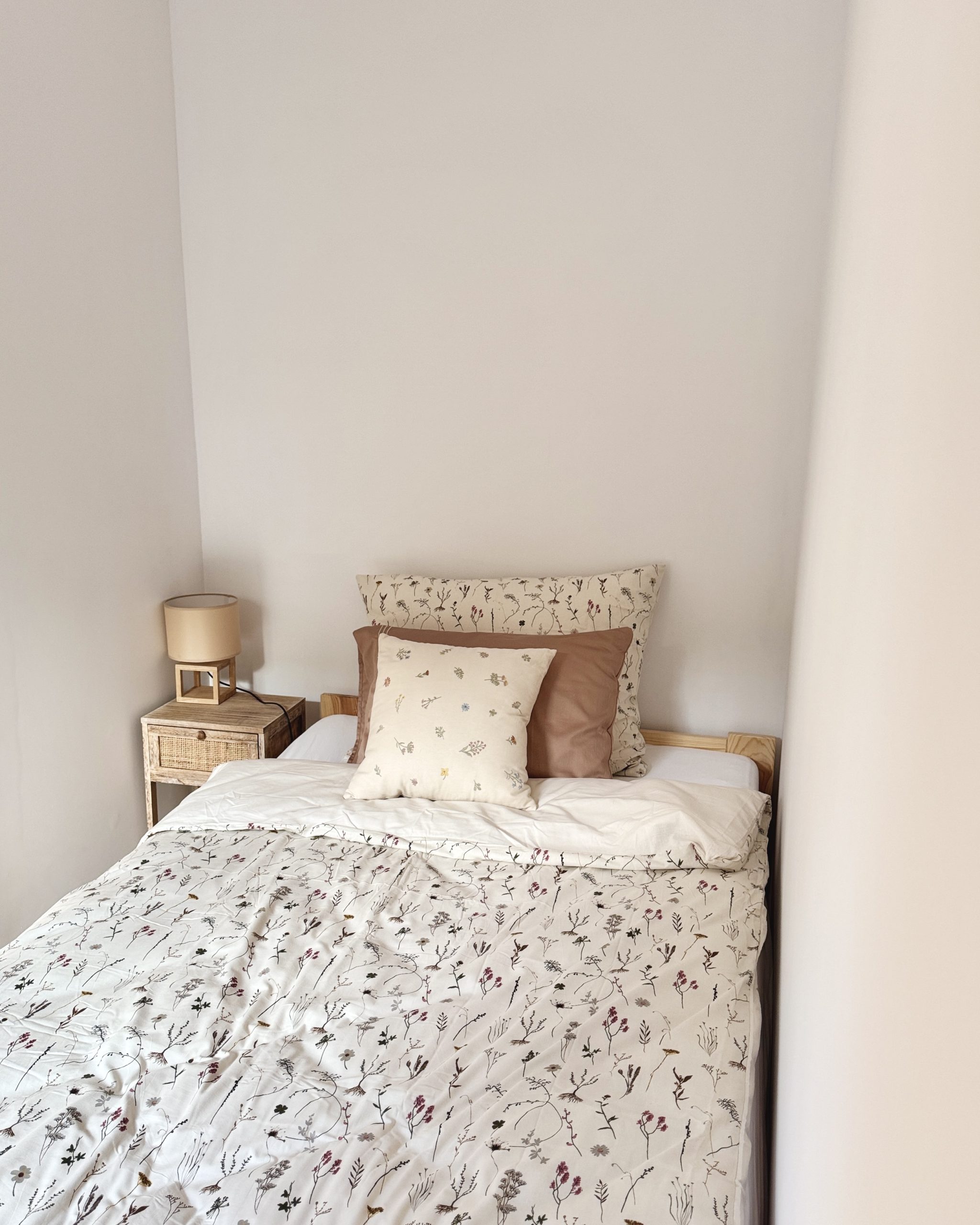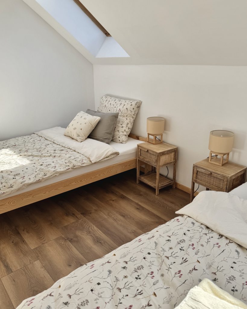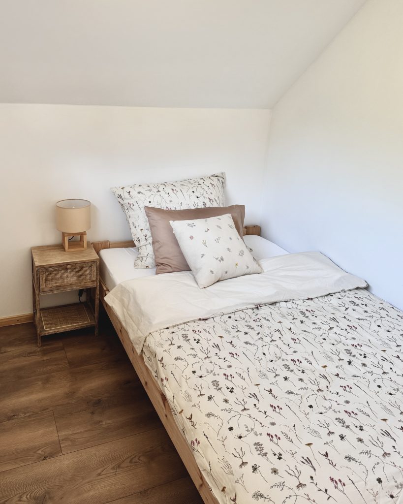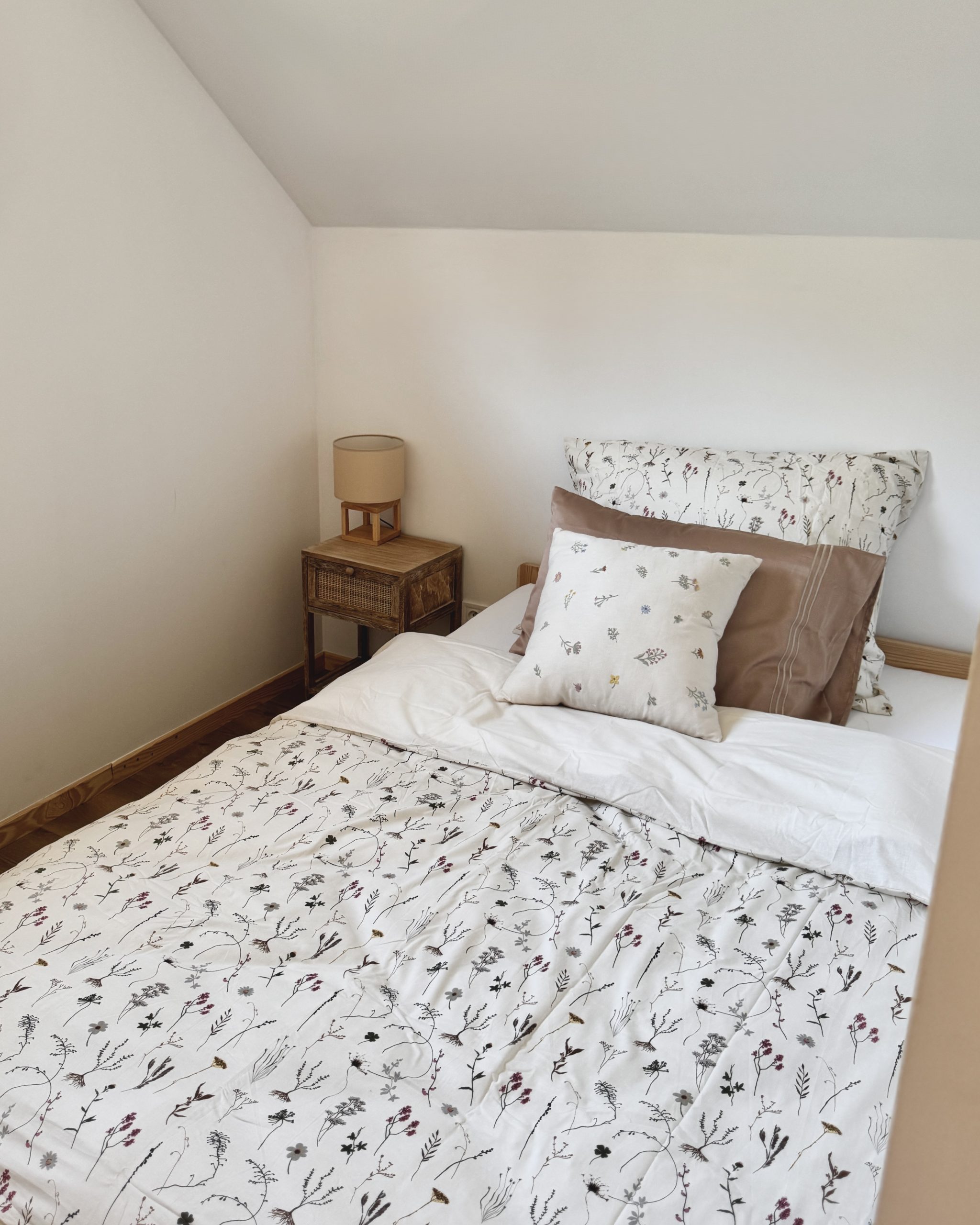 Mamy 7 kameralnych pokoi – dwu- i jednoosobowych – zaprojektowanych tak, by po intensywnym dniu warsztatowym lub rodzinnym spacerze możliwy był prawdziwy odpoczynek. Postawiliśmy na jasne barwy, miękkie tekstylia, a widok na zieleń wspiera spokojny rytm snu i poranków.